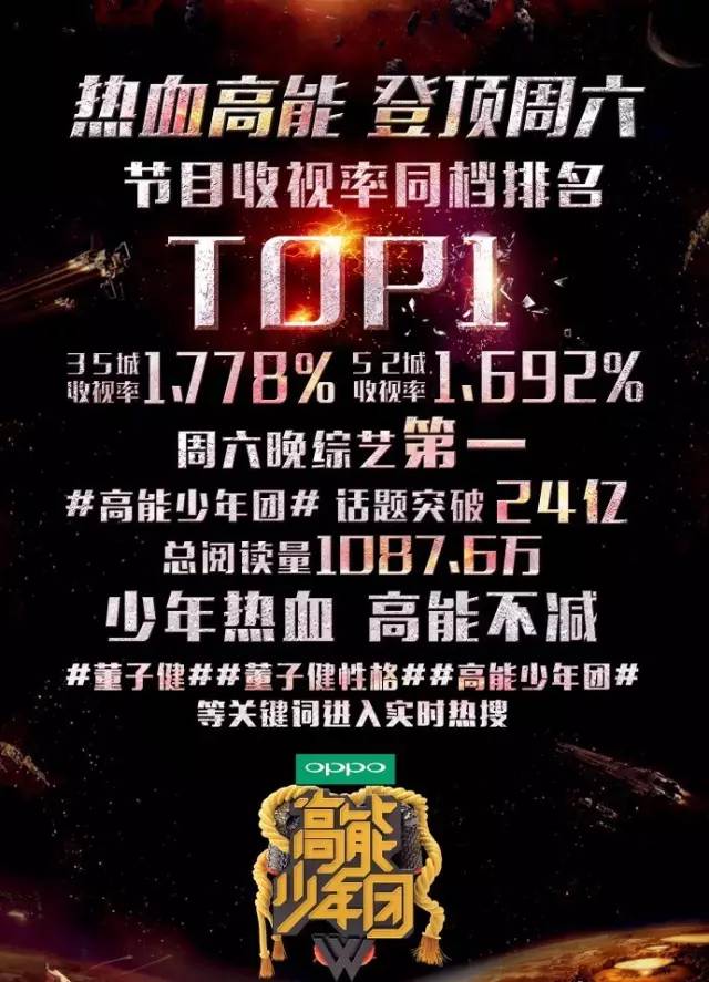 《高能少年团》自开播以来收获无数好评,节目热度也在逐步提升,五位少年一路闯关,经历了众多寓意深刻的高能挑战,在完成任务的同时逐步成长,将少年人特有的青春热血展现在观众眼中。据酷云EYE数据显示,第七期的“高能任务课”平均关注度为0.4299%,达到了开播以来的最好成绩,CSM52城收视率也依旧居高不下,1.692%的好成绩稳居同时段第一。