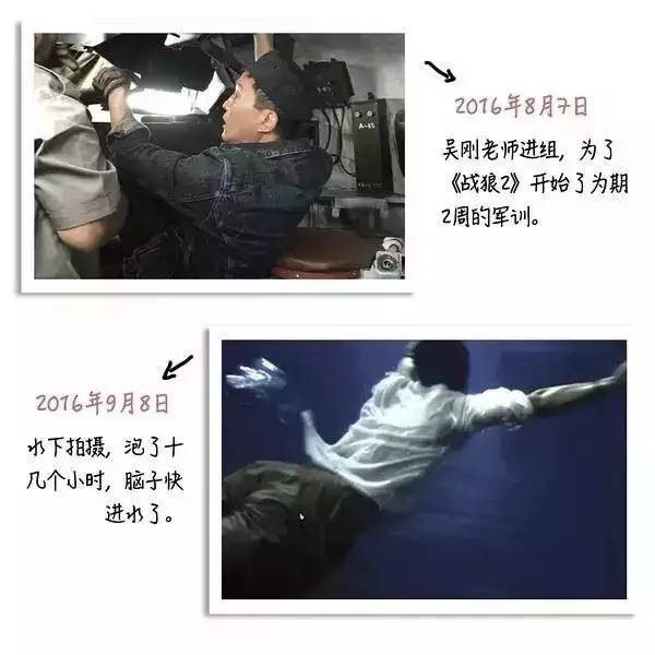 前面提到的那场水下打斗戏,演员在水中拍了整整13个小时,不能带氧气瓶,只能轮换吸氧,吴京中间更是一度体力不支,后来被救援人员救上岸。