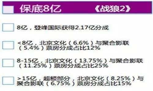 按照保底发行协议,北京京西文化旅游股份有限公司(下称北京文化)与关联方北京聚合影联文化传媒有限公司(下称影联传媒)联合保底8亿票房,8亿内双方共分成12%;8-15亿共分成25%;超15亿共分成15%。