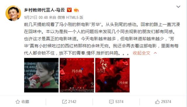 马云在看完影片后深受触动,在微博为电影点赞,感慨道:“今天电影越来越多,但电影味道却越来越少,“芳华”真有小时候吃过的西红柿那样的余味无穷。我还会再去看这部电影,里面有每代人都会锁不住,放不下的青春,情怀,挫折的共鸣。”