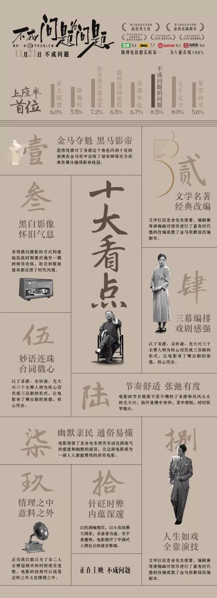由北京文化联合出品并发行,梅峰执导,范伟、殷桃、张超、史依弘、王瀚邦、王梓桐等人主演的《不成问题的问题》11月21日上映当日,票房破百万,好评如潮,豆瓣评分8.1,众多观众为范伟的演技所折服,亦为故事当中对折射出的中国式人情拍案叫好,“一出生动的官场现形记”、“细细琢磨,做人做事皆有悟”,不少观众也表示电影出乎意料的没有文艺片的沉闷,反而处处是戳穿人情事后快意的笑声。