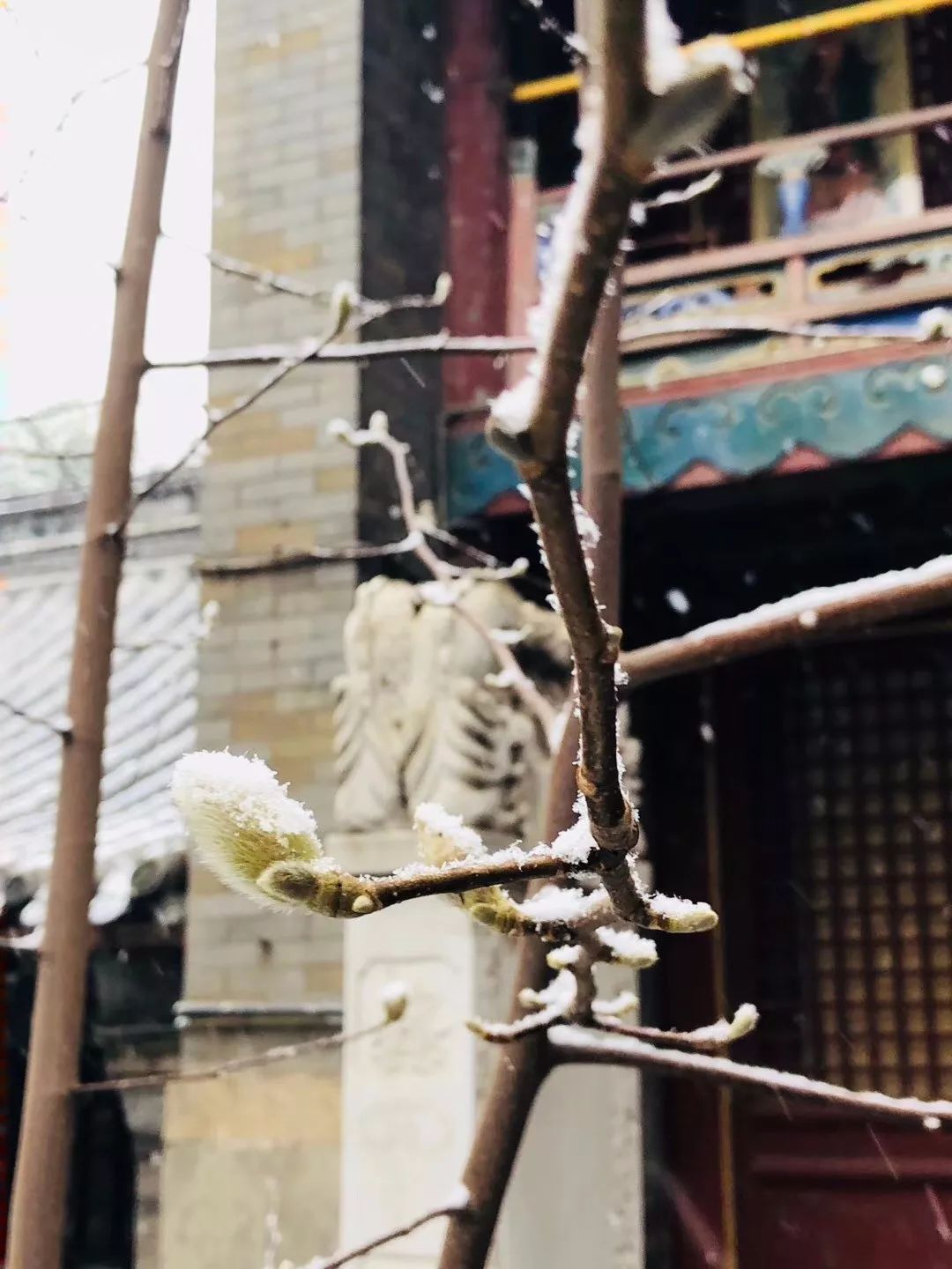 除了这些耐寒的长青植物外,潭柘寺闻名遐迩的玉兰花也悄然间探出雪白的嫩芽,含苞待放。而被这场大雪惊动的小生物们在雪地间窜动,庄严的古寺一时间多了几分闲云野趣的味道。
