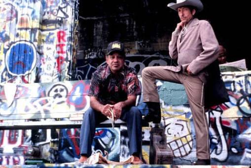 《比利小子》(Pat Garrett & Billy the Kid)1973年,鲍勃·迪伦和暴力美学大师山姆·佩金法合作了电影《比利小子》,迪伦饰演一个名叫“Alias”的角色,Alias的词意是“别名”,并且为电影演唱了主题曲,也就是他的经典之作——《Knockin' On Heaven's Door》。比利小子是美国历史上的传奇罪犯,真名为威廉·邦尼(William Bonney),他年轻时四处流浪,最擅长的就是拔枪射击。导演山姆·佩金法是赫赫有名的美国动作电影大师,暴力美学的开山鼻祖。佩法金当时并不熟悉迪伦,听了他专门为电影写的两首歌《Billy》和《Goodbye Holly》后,给了他这个角色。 Alias是片中最神秘、最模糊的角色,迪伦在车祸之后的隐居生活使得这个角色像是为他量身定做的一样。