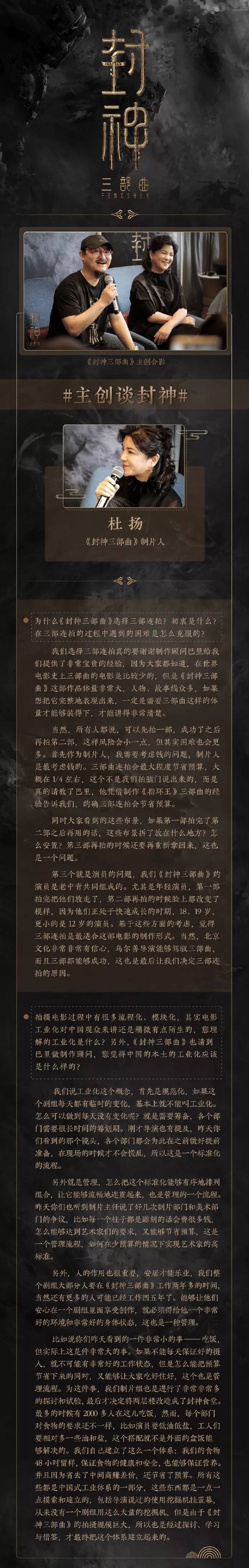 而作为制片人,杜扬也对工业化进行了解读,她谈到,如今《封神三部曲》从三个方面对电影⼯业化体系进行⼀次重建:⼀是规范化,管理层⾯建⽴⼯作规则和模式,建⽴标准化的流程;二是管理,如何把标准化流程有序地排列组合是⾮常关键的事情;三是⼈的作⽤,安居才能乐业,为剧组的⼯作⼈员提供好的环境和最佳的身体状态,才能享受创作。