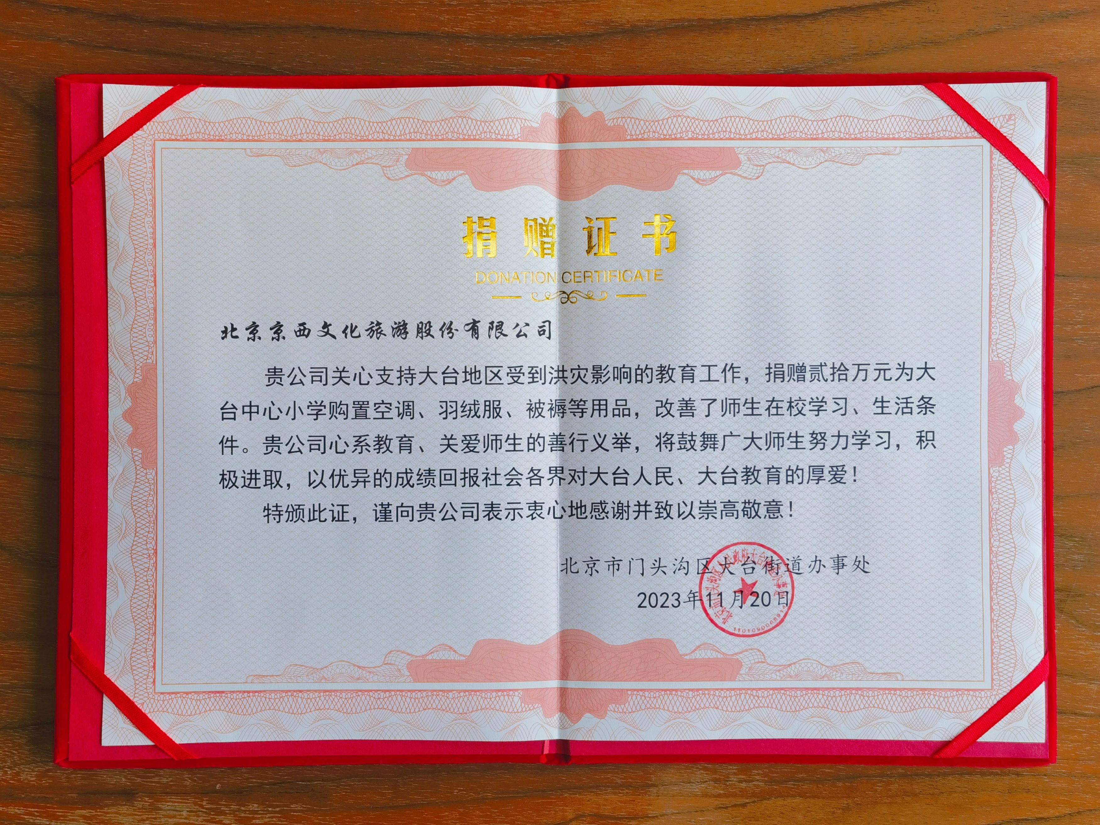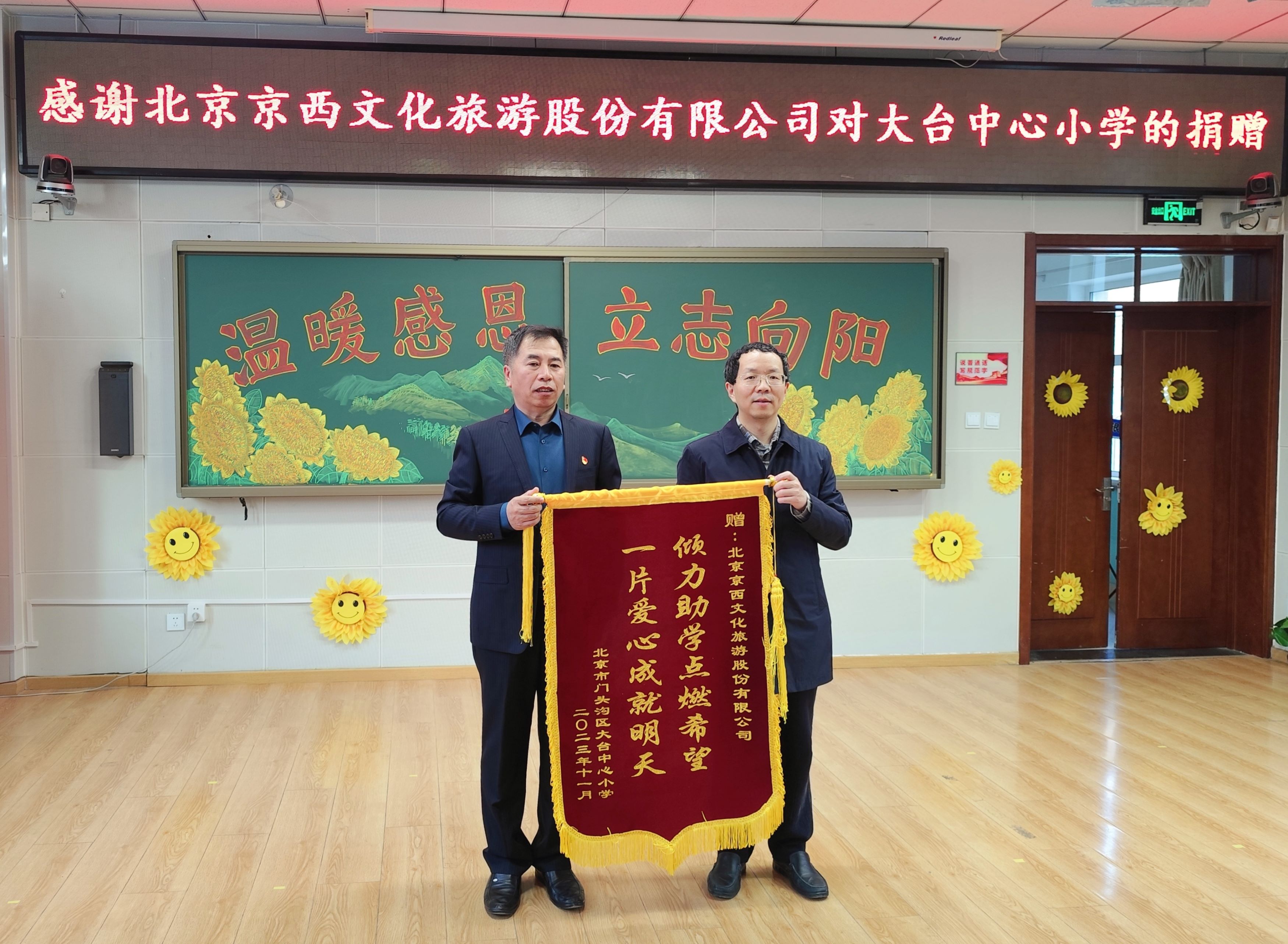 表演结束后,大台中心小学为我司回赠了一面“倾力助学点燃希望,一片爱心成就明天”的锦旗,同时大台街道办事处还为我司颁发了捐赠证书,以表达对北京文化的感谢及敬意!