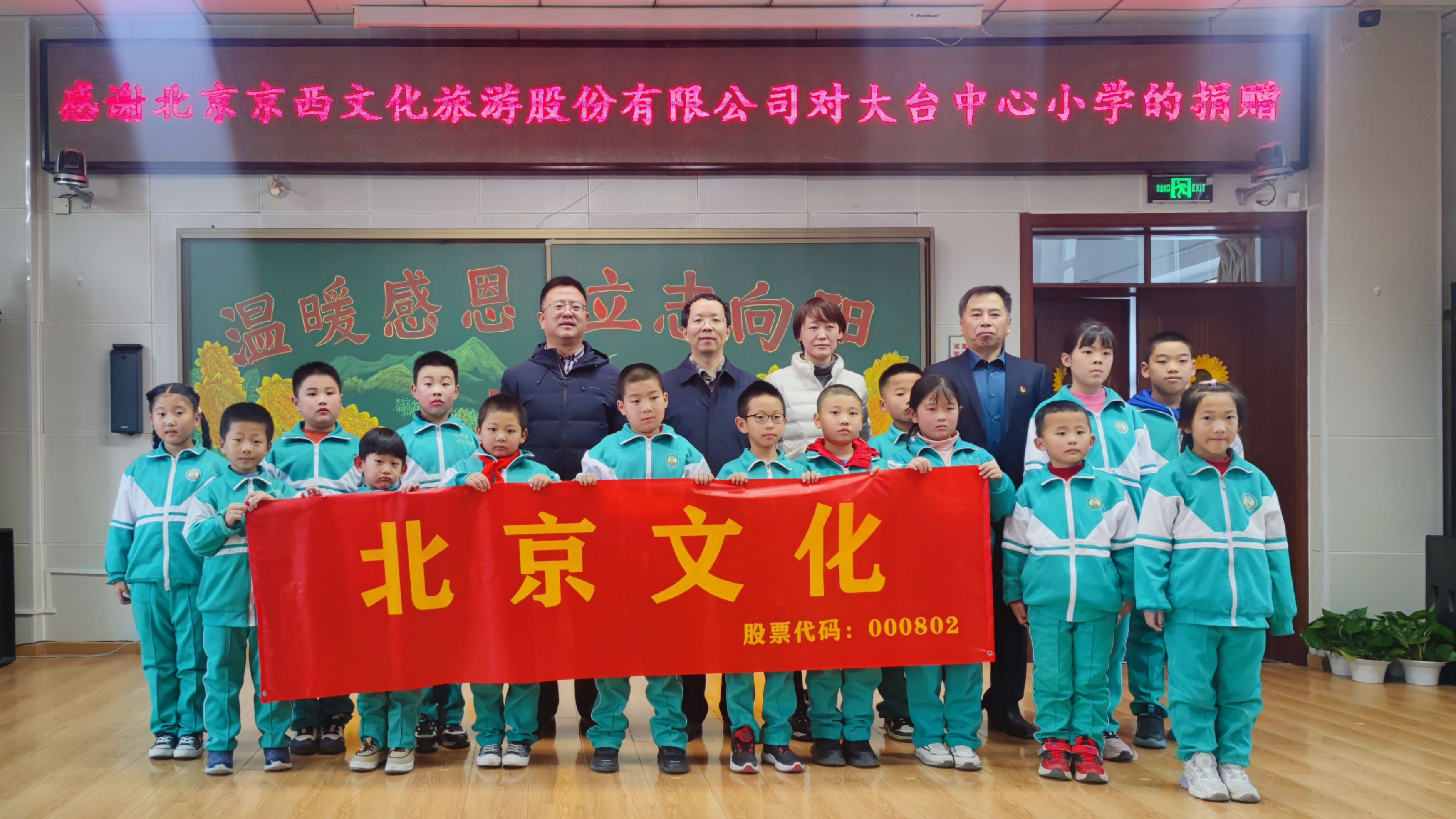 2023年7月29日至8月2日北京市遭遇历史罕见特大暴雨,“一方有难,八方支援”,北京文化作为上市公司,在获悉大台中心小学受灾严重后,为积极履行社会责任、践行社会主义价值观,通过中华思源工程基金会向门头沟区大台中心小学捐赠善款,用于学校灾后重建。北京文化用善举温暖受灾学子,传播大爱,回报社会。