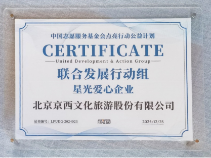 北京京西文化旅游股份有限公司(股票代码:000802,简称“北京文化”)于2025年1月4日参加了点亮行动公益计划年度特别活动,荣膺中国志愿者服务基金会授予的“联合发展行动组 星光爱心企业”称号。