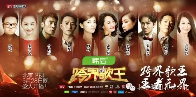 《跨界歌王》是北京电视台联合北京文化重磅推出的首档大型明星跨界音乐节目,集合当红影星王凯、刘涛、白百何等。2016年5月28日开始,在北京卫视每周六21:18播出。在大数据时代,《跨界歌王》首播引领了各项数据,出了耀眼的成绩单。首播全国35城收视率1.49%;热门话题总榜第一;微博热搜第一;疯狂综艺季第一;微博电视指数第一;百度指数第一;#跨界歌王#阅读量超9.6亿,北京时间总曝光量超10亿,这些数据表明了《跨界歌王》的现象级指数。