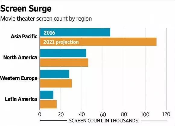 亚太地区所拥有的电影院数量目前已经是全球第一(数据来源:普华永道)