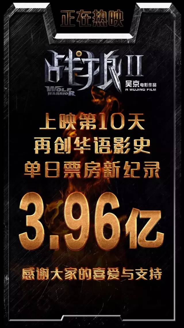 8月5日,已上映10天的《战狼2》仍然保持着毫不衰竭的观影动力,单天票房高达3.93亿,刷新了上周日由它自己创下的国产电影单日票房纪录。