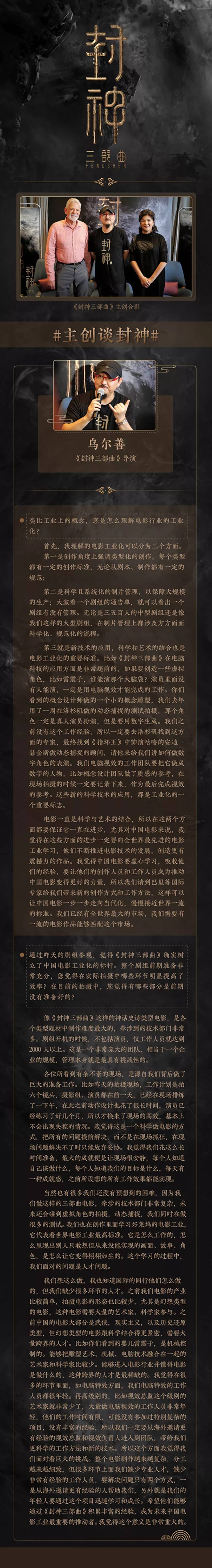 2月19日乌尔善导演出席《阿丽塔:战斗天使》的首映现场,与詹姆斯·卡梅隆的会面多了些大师之间的惺惺相惜。同样是用十多年的时间全力打造《阿凡达》系列的导演詹姆斯·卡梅隆,完全能理解时间与经历的沉淀对于影片的重要性。在听完乌尔善导演对《封神三部曲》的介绍之后,倍感惊喜之余卡梅隆鼓励到:坚持下去。