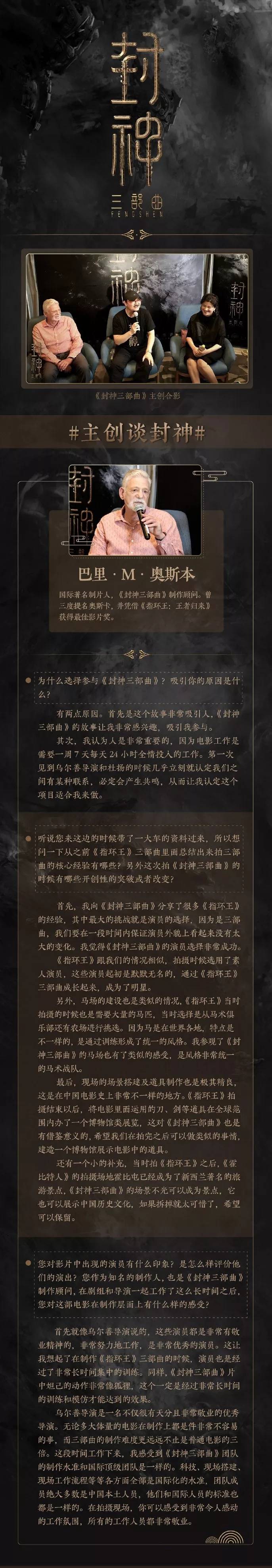 巴⾥·M·奥斯本作为金牌制作人,曾参与《指环王》、《黑客帝国》等经典影片的制作。据悉此次担任《封神三部曲》制作顾问,巴⾥·M·奥斯本带来了⼀⼤车的资料,为该⽚贡献了《指环王》的核⼼制⽚管理经验。“《封神三部曲》团队的制作水准和国际顶级团队是一样的,科技、现场的搭建、现场工作流程等等各方面全部都是国际化的水准,团队成员绝大多数是中国本土人员,他们的专业能力已达到和国际成员一样的标准。”巴里对《封神三部曲》的⼯业化体系给予了肯定。