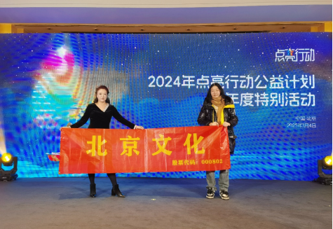 北京京西文化旅游股份有限公司(股票代码:000802,简称“北京文化”)于2025年1月4日参加了点亮行动公益计划年度特别活动,荣膺中国志愿者服务基金会授予的“联合发展行动组 星光爱心企业”称号。