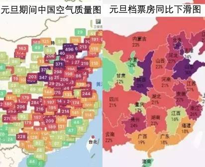 在大盘跌幅23%的情况下,北京及天津降幅竟高达34%。单地区这样的降幅已经不是一句“片子不行”能够解释得清楚了。雾霾严重的华中、华北都是票房大幅下降的地区。但是,唯独空气最佳的海南省同比无变化,青海和宁夏有小幅增长,特别“抗跌”的西北地区正是中国空气版图上的“无霾区”。