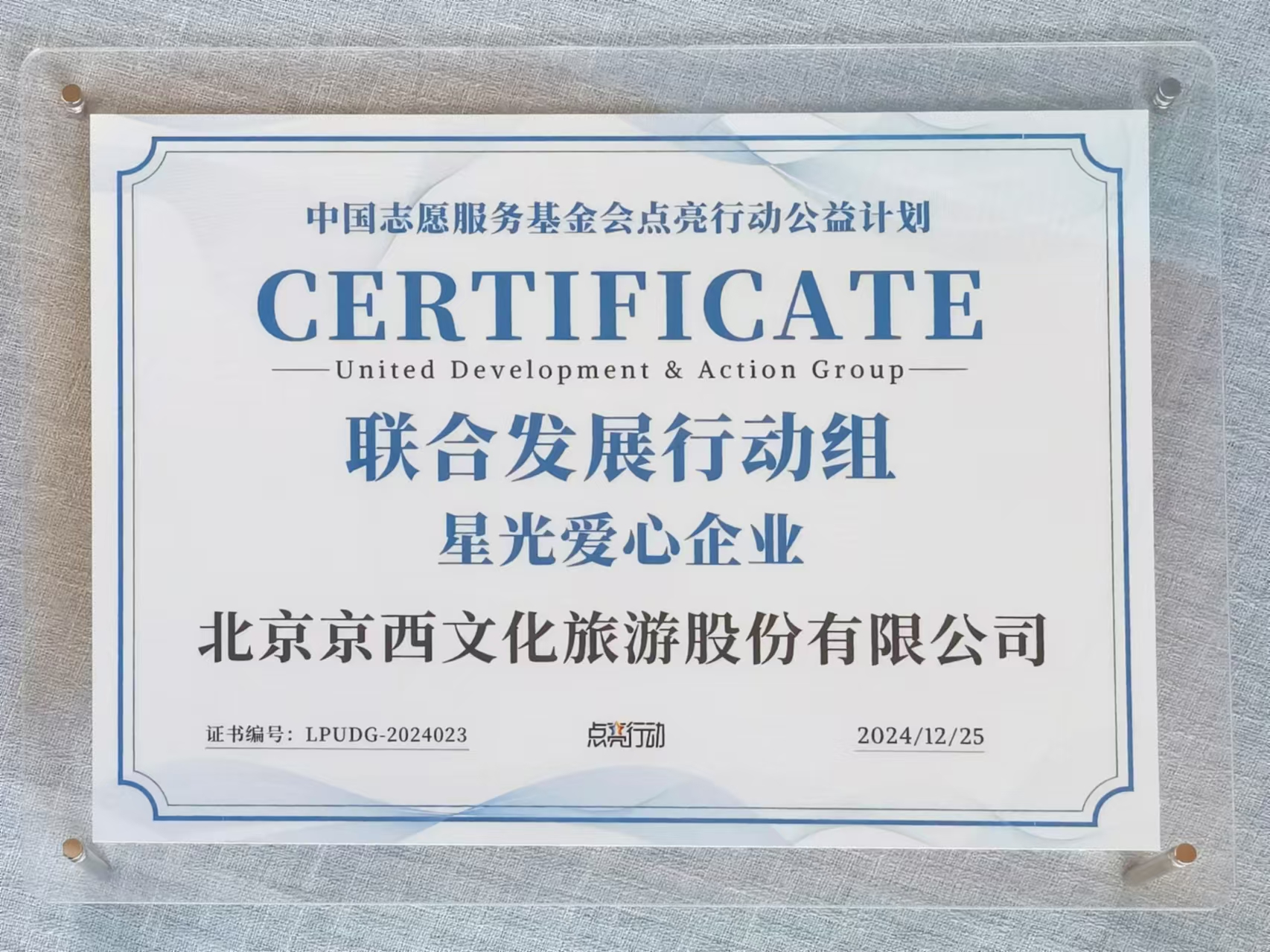北京京西文化旅游股份有限公司(股票代码:000802,简称“北京文化”)于2025年1月4日参加了点亮行动公益计划年度特别活动,荣膺中国志愿者服务基金会授予的“联合发展行动组 星光爱心企业”称号。