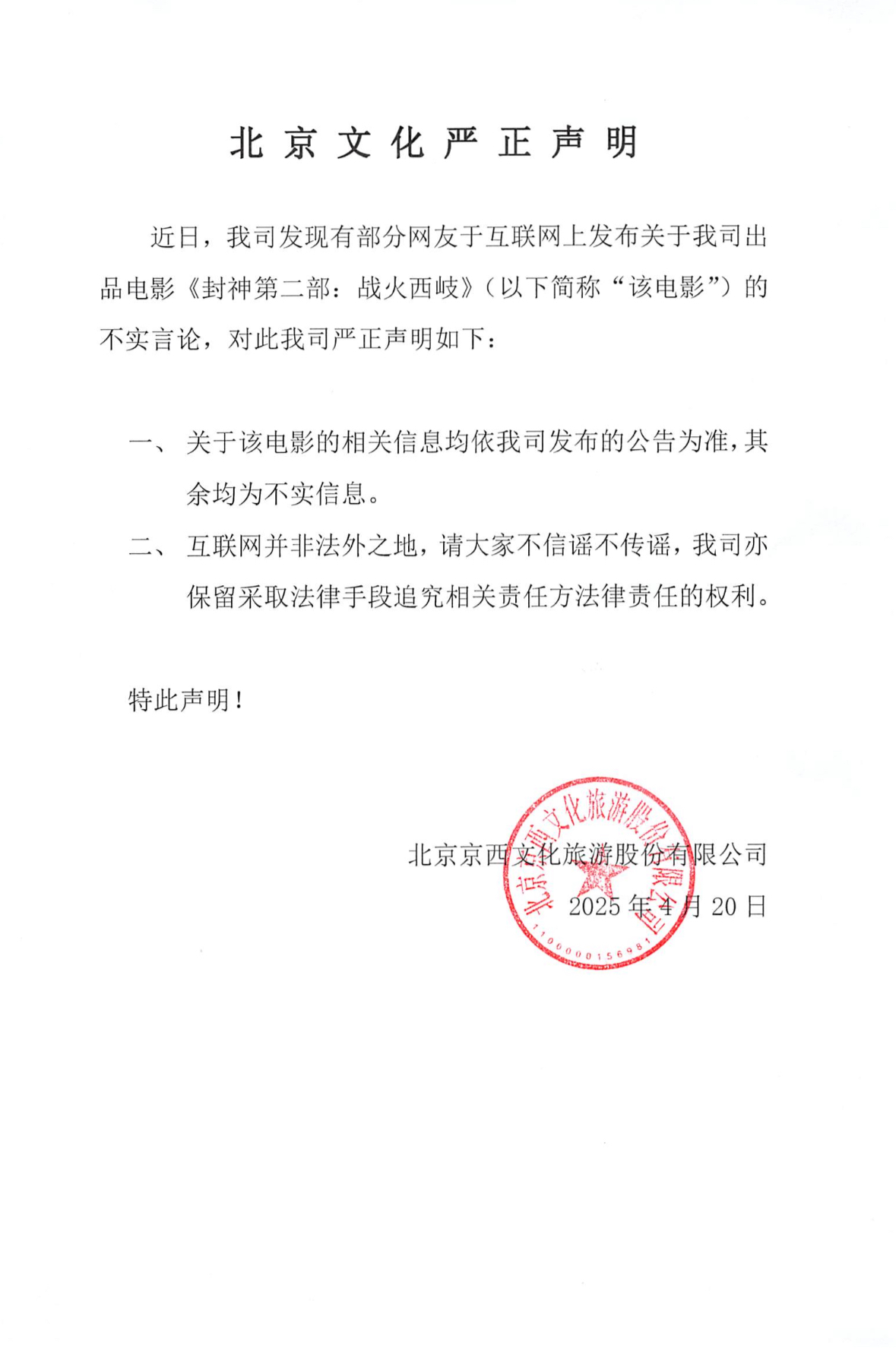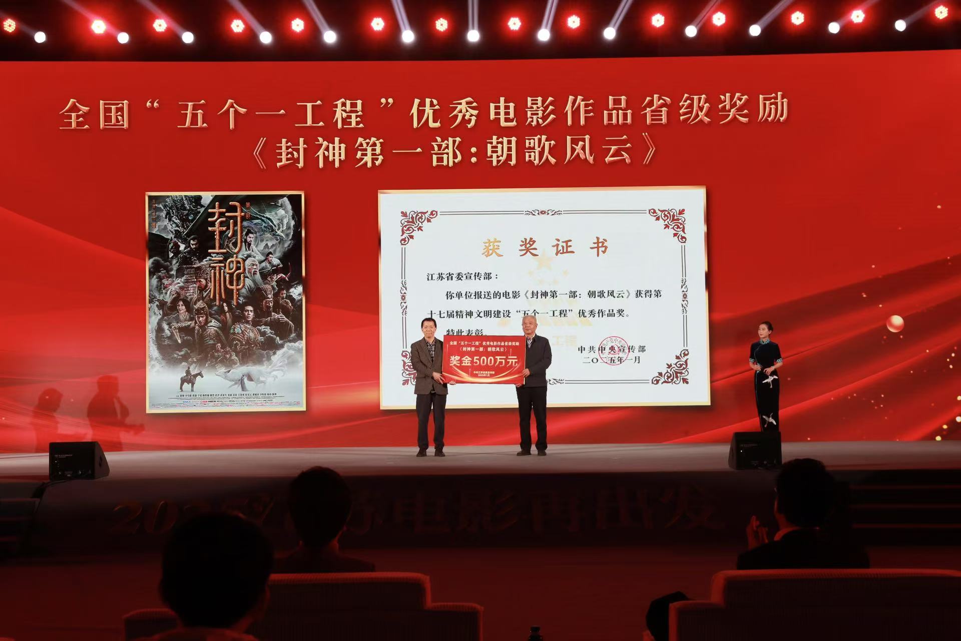 江苏省委宣传部、江苏省电影局于2025年1⽉17⽇下午3点在扬州市江都区扬州影视基地举办2025“江苏电影再出发”发布活动暨扬州影视基地启⽤仪式。活动中,为北京文化公司出品的影⽚《封神第⼀部:朝歌⻛云》颁发全国“五个⼀⼯程”优秀电影作品省级奖励:十七届精神文明建设“五个一工程”优秀作品奖。